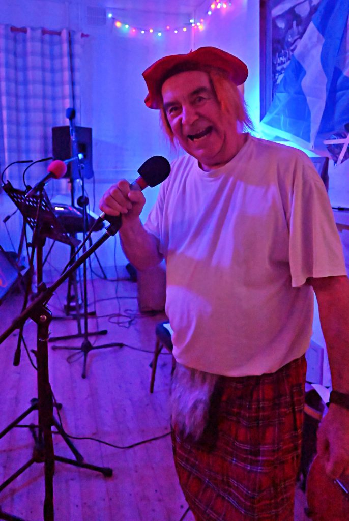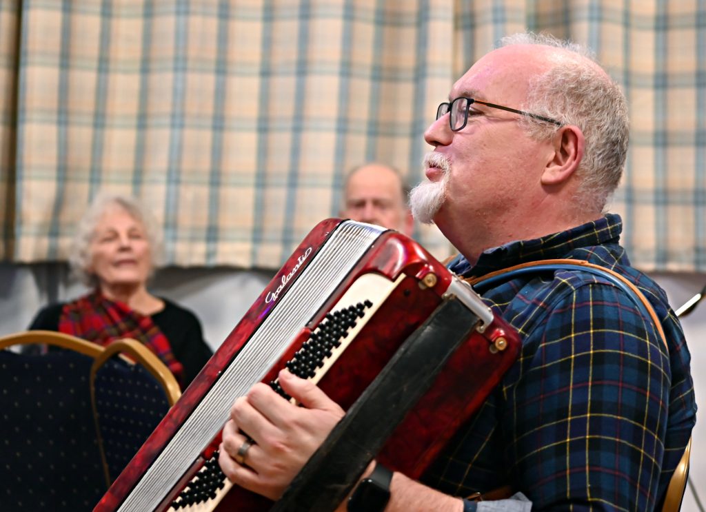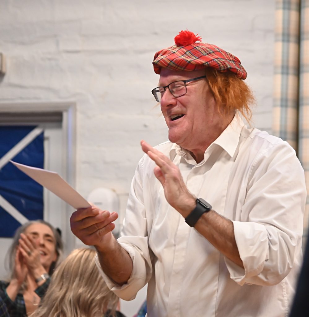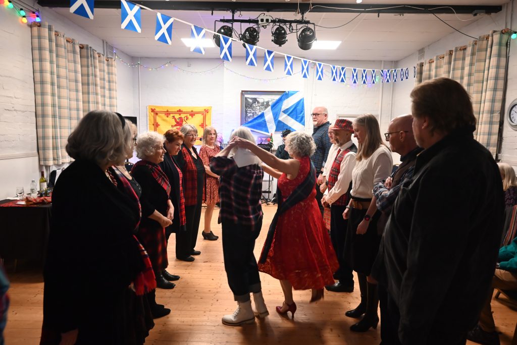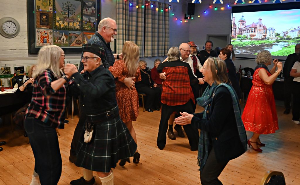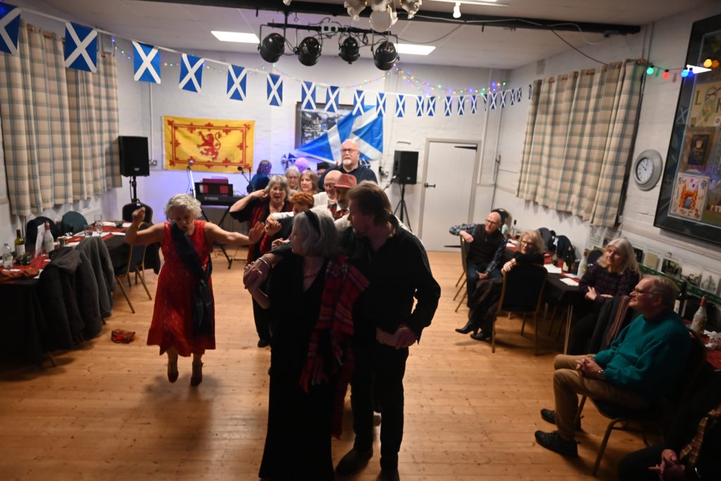 Jim Patman then paid tribute to the village’s own Jock Hargreaves and there was an irreverent rendition of one of Jock’s favourite songs: “Oh ye cannae push your granny of the bus!” Nigel, Jenny, Russ and Penny continued the music theme, leading a boisterous sing-along of Scottish songs. This was followed by Tim Heywood’s thoughtful and engaging performance of three more Scottish folk songs accompaning on accordion. Philippa then instructed an enthusiastic selection of volunteer residents in “The Gay Gordons”, “The Dashing White Sergeant” and “Strip the Willow”. The survivors completed the friendly, fun night with Auld Lang Syne and somewhat zealous dad disco dancing.