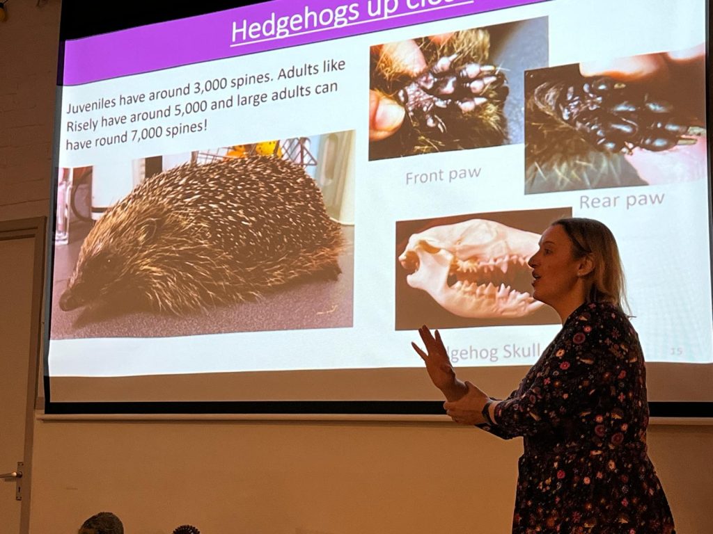 Her illustrated talk this evening was enjoyed by over 40 attentive and enthralled guests eager to learn about our native, enigmatic but endangered hedgehog. Who knew a healthy male hog could roam 1.8 kilometres a night? That a female might bear several kittens with different fathers? That the UK has a quarter of Europe’s badger population, a serious hedgehog predator!! That hedgehogs’ life cycle is altering as our climate changes, their food sources are at risk because of our increasing love affair with concrete, that their population has reduced by 50% over the last 75 years?